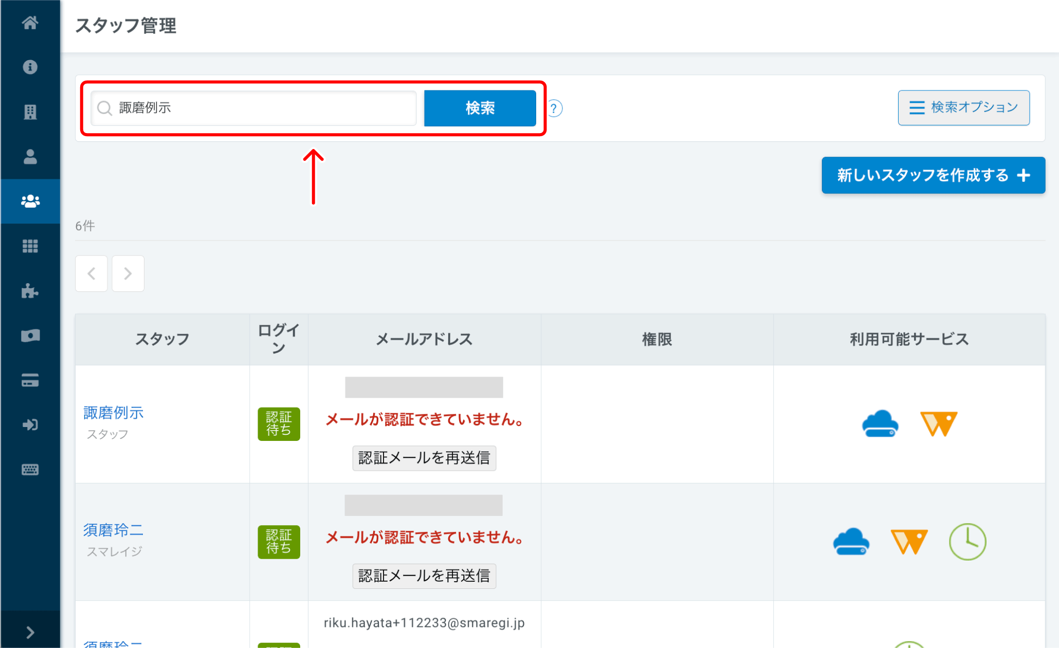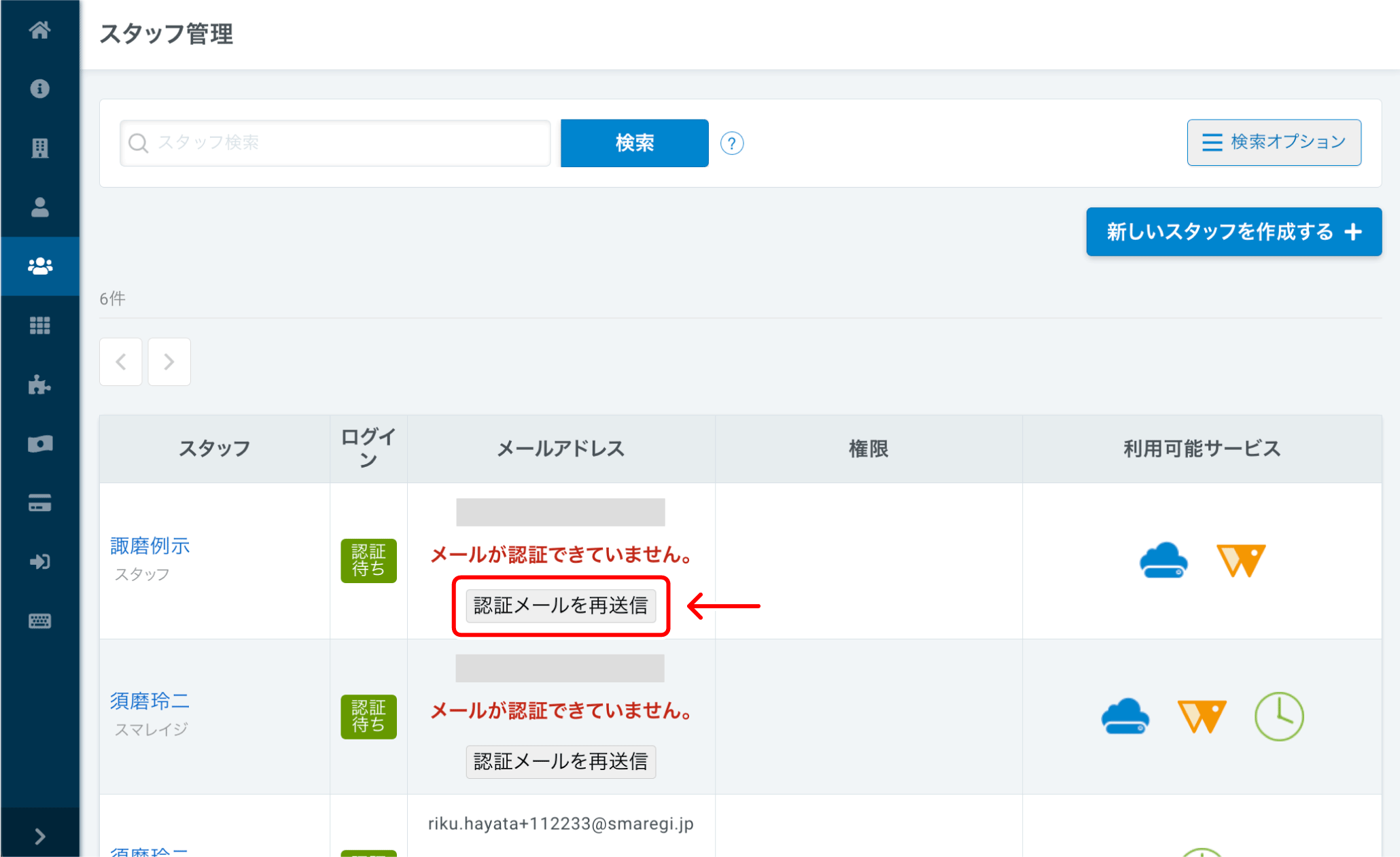 該当するスタッフ名のメールアドレス欄に表示されている【認証メールを再送信】をクリックします。