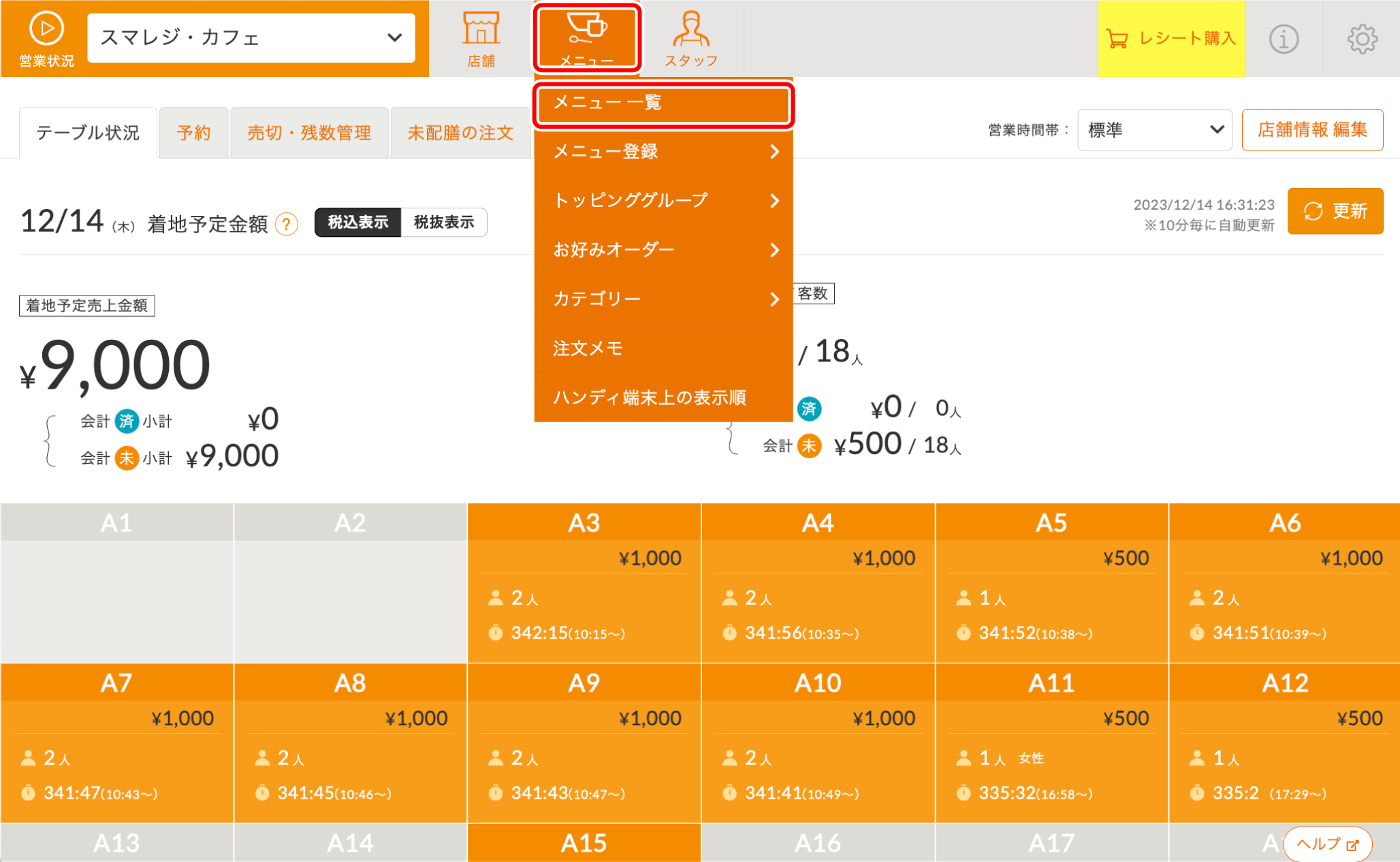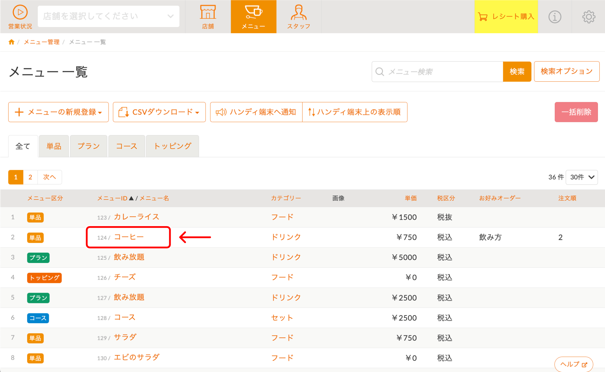 管理画面にて、『メニュー > メニュー一覧』をクリックします。 -