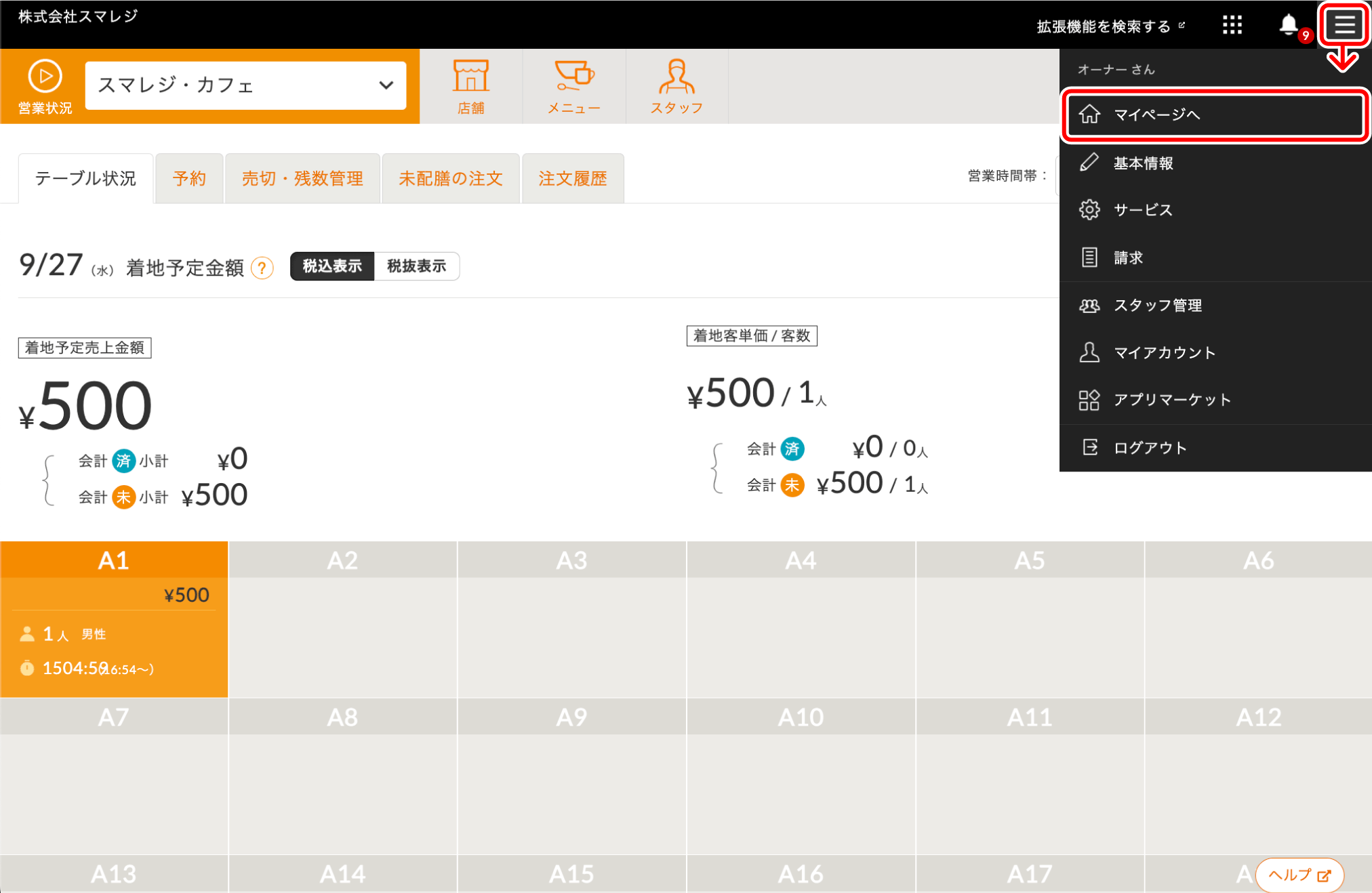 それぞれの管理画面から、『管理画面右上の【≡】 > マイページ』をクリックします。