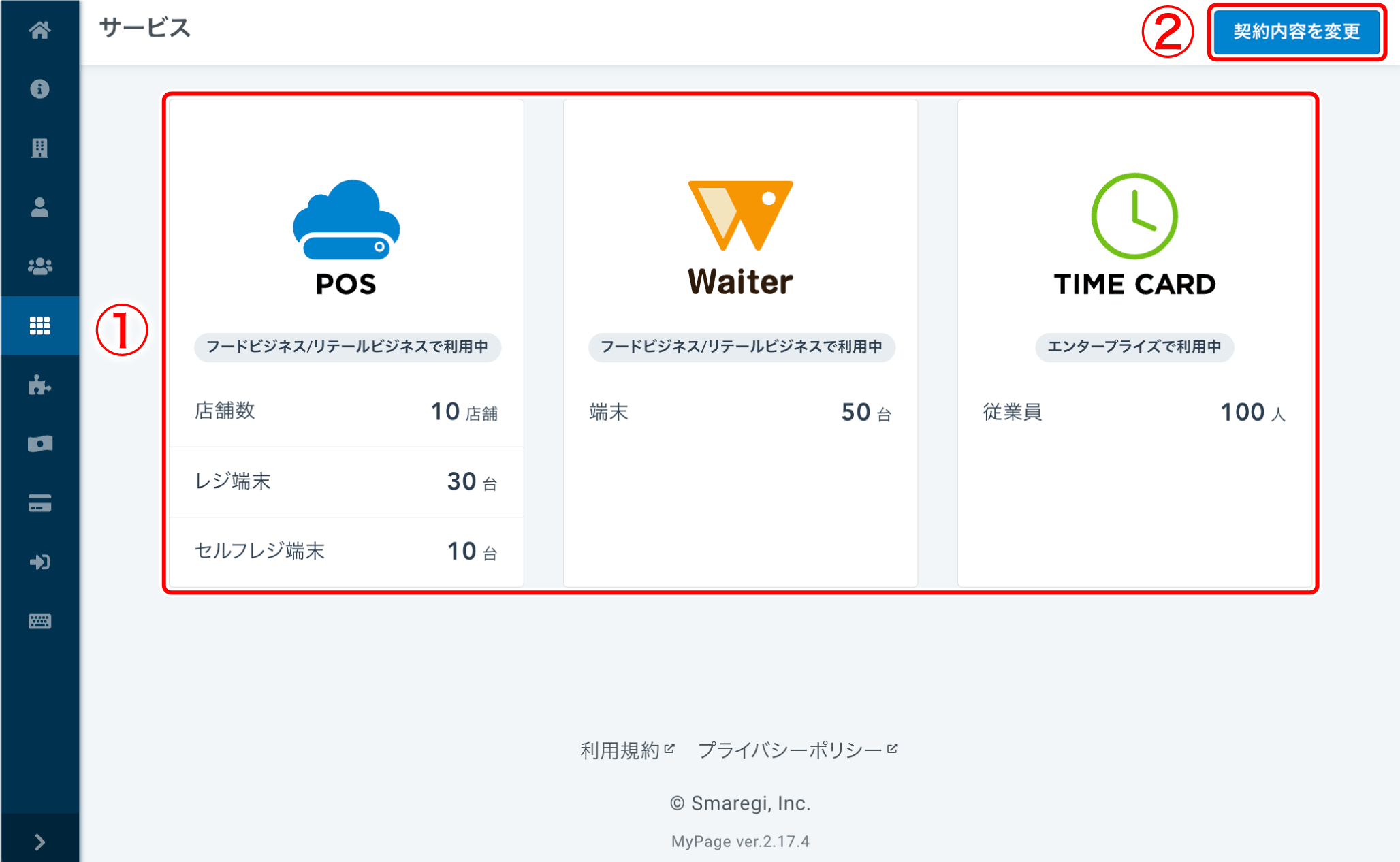 ①ご契約いただいているサービスと料金プラン、追加オプションの内容が表示されます。