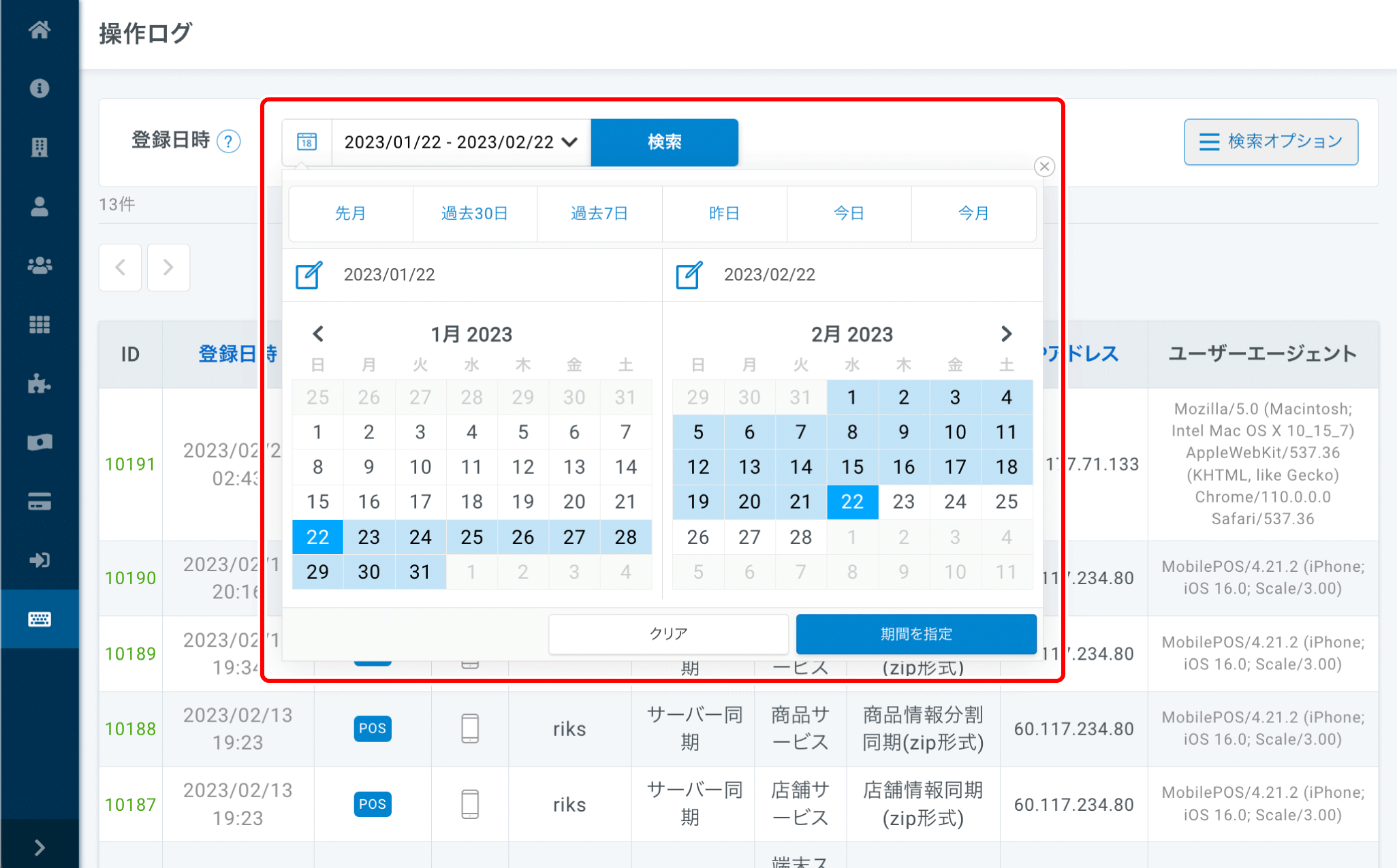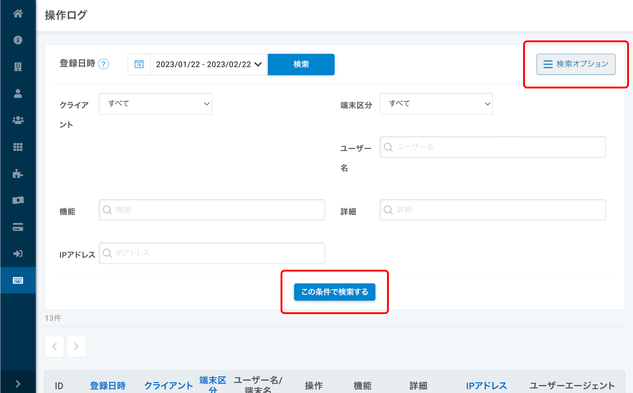 操作ログは期間を指定して検索することが可能です。