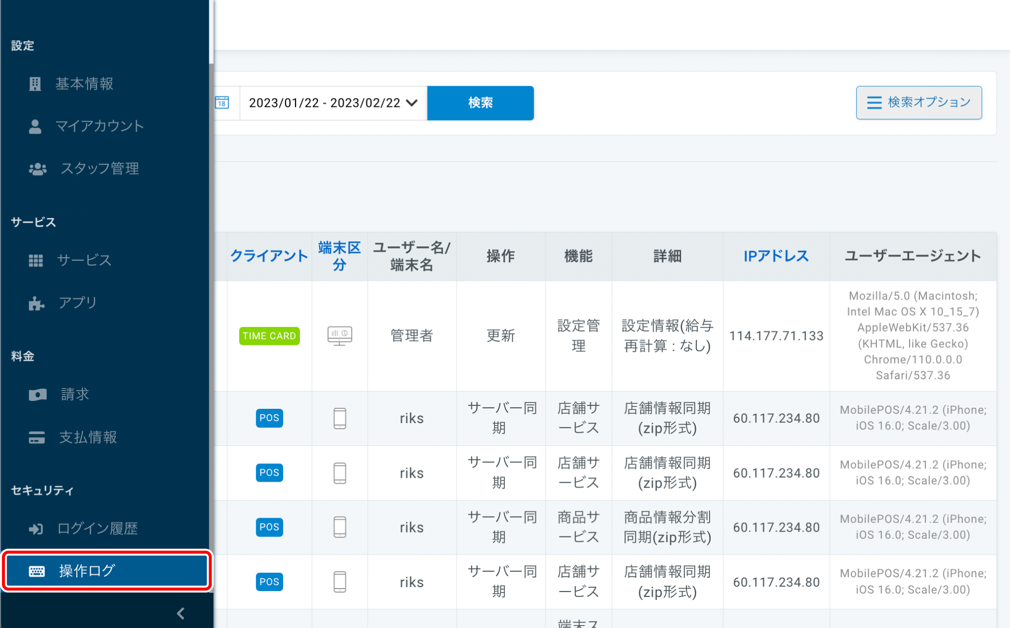 左メニューの『操作ログ』をクリックします。操作ログの項目一覧項目 説明 ID 操作を行なうとIDが自動採番されます。 登録日時 操作を行なった日時が表示されます。 クライアント 利用したサービス名が表示されます。 端末区分 管理画面かアプリの操作であるかが表示されます。 ユーザー名/端末名 管理画面にログインしているユーザー名/アプリを利用している端末の名称が表示されます。 操作 どのような操作を行なったかが表示されます。 機能 利用した機能名が表示されます。 詳細 利用した機能で、どの操作を行なったか表示されます。 IPアドレス 操作した端末のIPアドレスが表示されます。 ユーザーエージェント 操作した端末の機種名やOSのバージョンが表示されます。 -