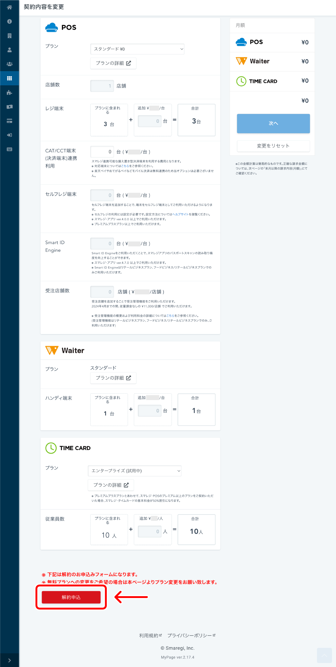 スマレジを解約(退会)する場合、管理画面のマイページで解約の申し込みが必要です。