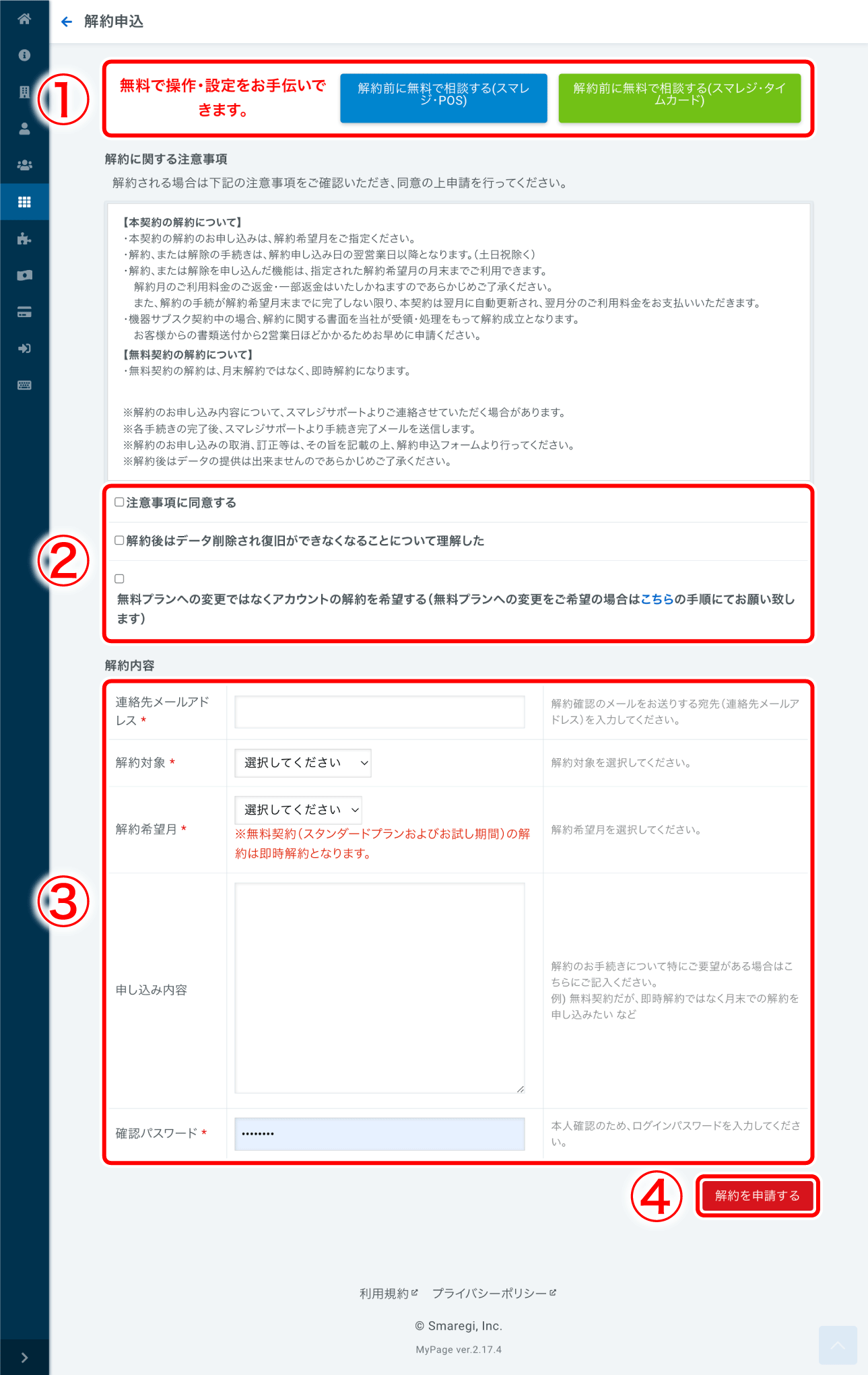 ④申請を確定するボタンです上記の②〜③を完了後、【解約を申請する】ボタンをクリックしてください。